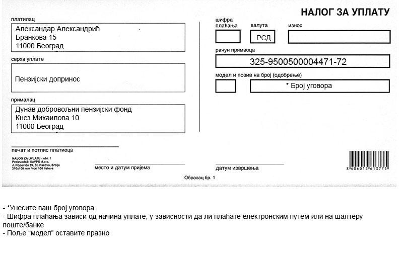 Пензијски допринос можете да уплатите искључиво безготовински: налогом за уплату у банци или пошти, путем административне забране, трајним налогом или онлајн.