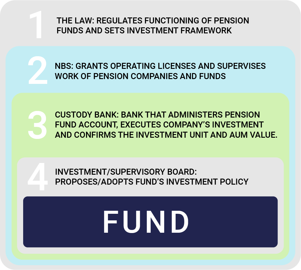 Supervision of pension companies and pension funds is multistage, external and internal. Since private pension is very important and relatively new financial product, the control of its use and development is continuous. This control is executed by the law, the National Bank of Serbia, Custody bank and Investment and the Supervisory board.